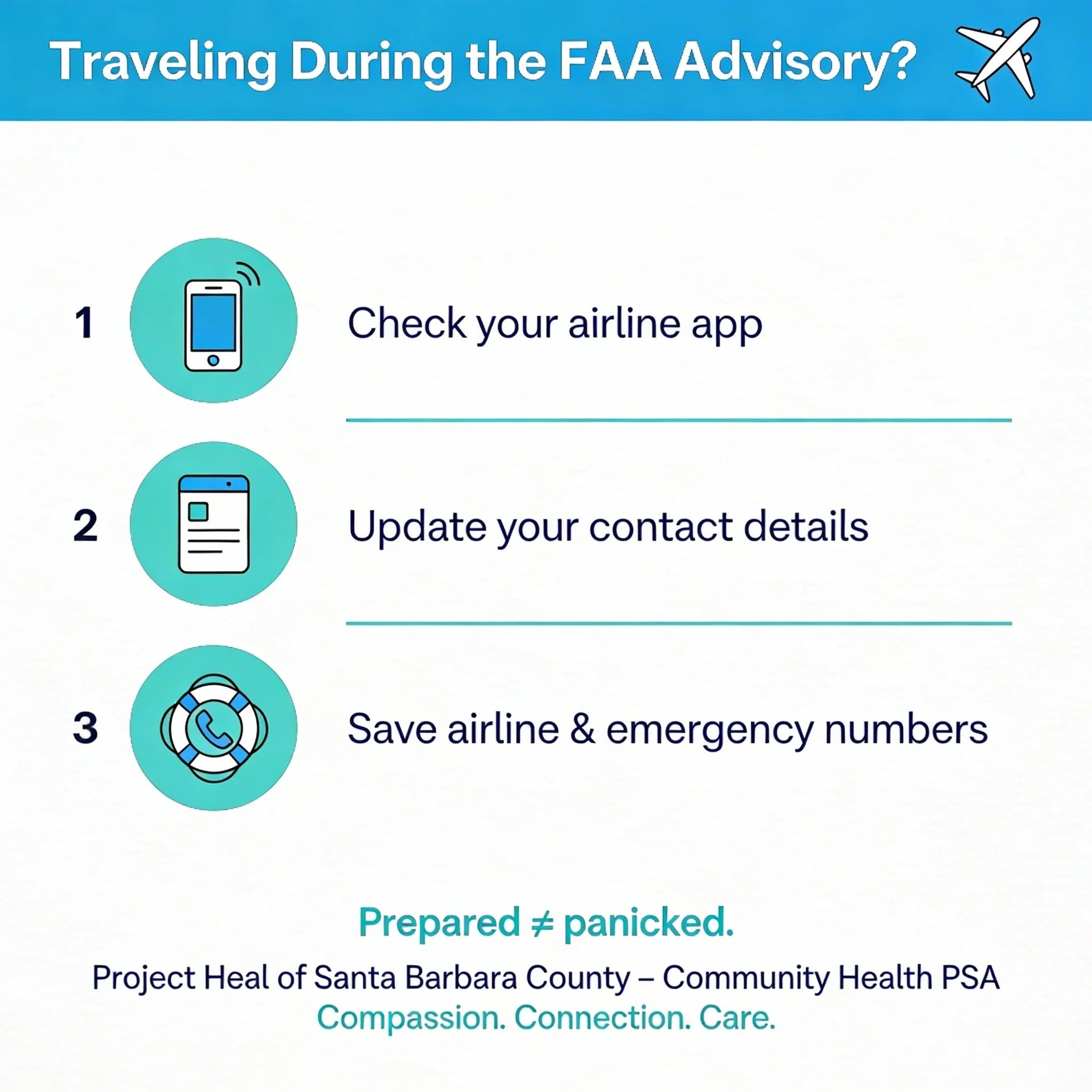 “Information shared by Project Heal of Santa Barbara County is for educational purposes only and does not constitute medical, legal, or travel advice. Please consult airlines, aviation authorities, and health professionals for guidance specific to your situation.”